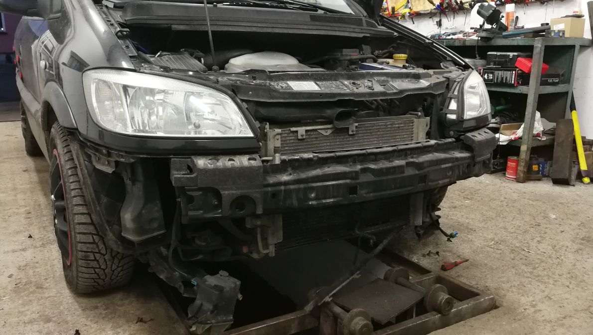 Zocha po zdjęciu zderzaka - widać że prawa lampa przeciwmgielna dynda na przewodzie elektrycznym bo została wyrwana z mocowań. Lewy przewód wisi zakończony niebieską wtyczką, bo lewa lampa została w zdjętym zderzaku. Wprawne oko zafiromaniaków dostrzeże też pewnie wiszącą, przegnitą dolną ramkę od chłodnicy klimy... :oops: Tak, tak... Niestety szykuje się zakup nowej chłodniczki, chociaż klima na razie działa... :)