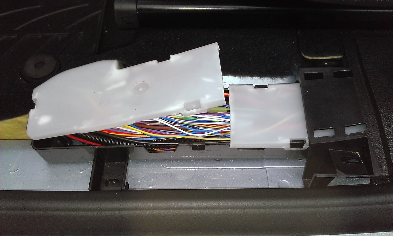2. Wiercimy otwór na diodę najpierw fi3-4mm, potem fi6mm 3. Wkładamy diodę do konsoli i składamy konsolę w odwrotnej kolejności 4. Zdejmujemy plastikową osłonę progu od strony pasażera(auto z kierownicą po prawej stronie), po stronie kierowcy(auto z kierownicą po lewej stronie) podważając ją plastikową łyżką od przodu u góry od strony uszczelki 5. Żeby nie zdejmować następnej osłony progu i słupka, przecinamy w połowie pokrywkę puszki nożem stanleyem podkładając od środka kawałek drewienka,plastiku albo blaszki chroniąc przewody przed przecięciem 6. Odchylamy zatrzaski puszki na zewnątrz i otwieramy puszkę
