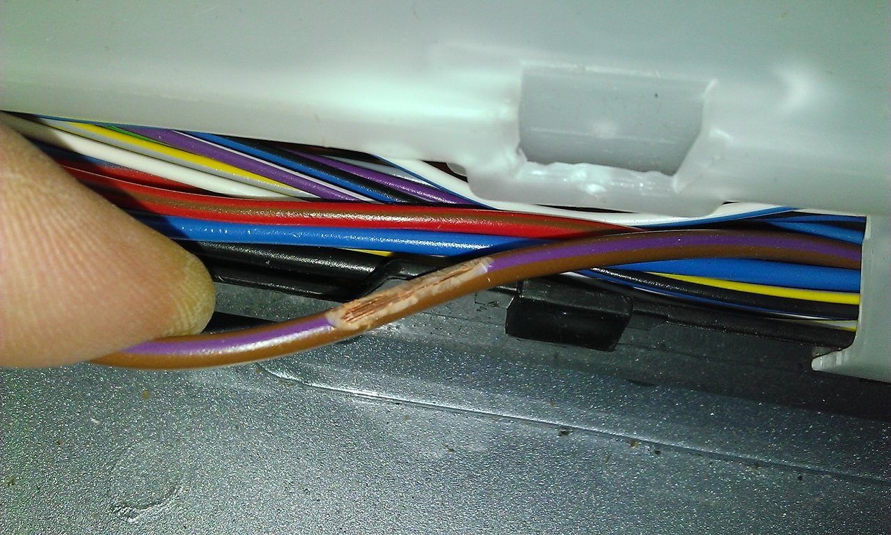 8. W puszce odnajdujemy 2 przewody: pierwszy gruby przewód koloru brązowo-fioletowego i drugi gruby koloru czarnego(są trzy czarne: najgrubszy z nadrukiem-białymi napisami to antena-ten nas nie interesuje, drugi nieco cieńszy to właśnie ten-nasz minus/masa i trzeci najcieńszy-ten też nas nie interesuje) i delikatnie wzdłużnie odcinamy nożem stanleyem izolację