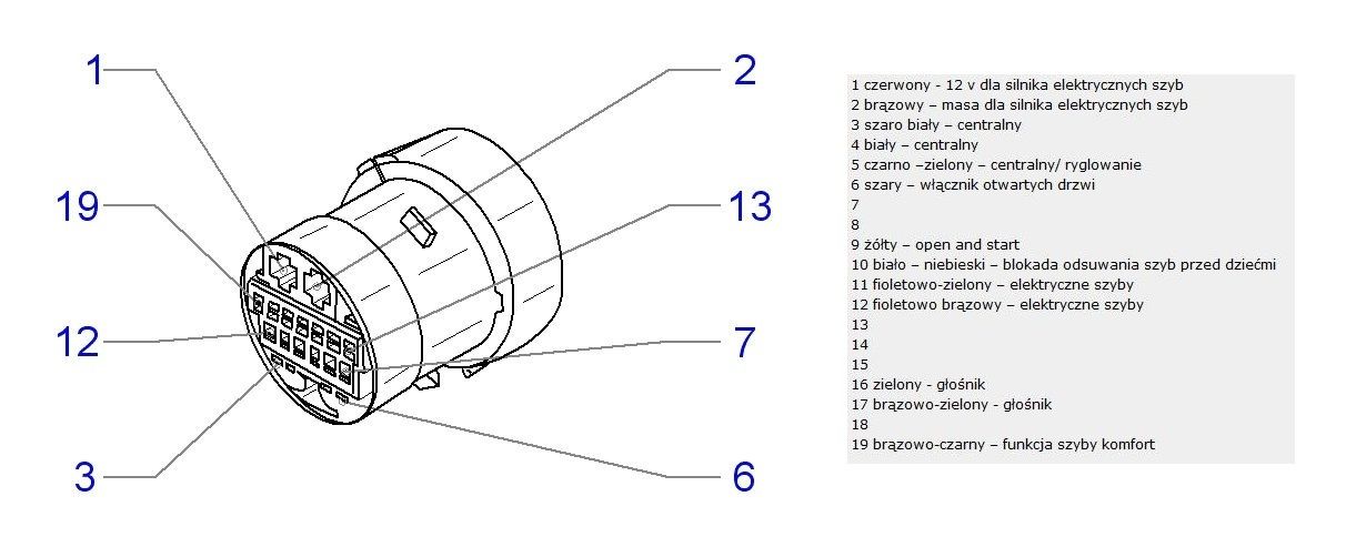 Wziąłem się za naprawę wiązki drzwi tylnych prawych. Problem pojawił się już na początku przy wyjmowaniu wtyczki. Okazało się, że kable pękły wszystkie na raz jakieś 2 centymetry od wtyczki i przy zdejmowaniu gumy ochronnej wtyczka po prostu została mi w rękach. Po przeglądzie kabli okazało się, że są dwa koloru białego i tu pojawił się problem ponieważ nigdzie nie mogę znaleźć opisu kabli wtyczki. Może ktoś z forumowiczów ma dostęp do tej jakże cennej dla mnie informacji? Będę wdzięczny za każdą próbę pomocy :)