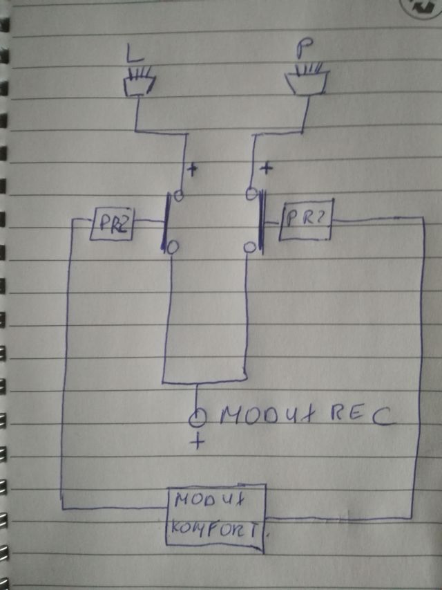 2. Gdybyśmy chcieli jednak doświetlać zakręty, np. prawy zakręt, wtedy moduł Łukasza włączyłby jednocześnie dwa halogeny jako standardowa akcja, ALE, jednocześnie dzięki dodatkowemu sterowaniu z modułu komfortu włączyłby przekaźnik lewego halogenu wyłączając lewą lampę na czas skrętu w prawo. W przypadku skrętu w lewo akcja włączy obydwa halogeny , a dodatkowe sterowanie z modułu Łukasza wyłączy prawy halogen.
