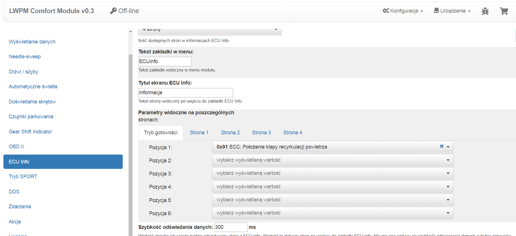 Zakładka ECUinfo: recyrkulacja powietrza: wł/w ruchu/wył.