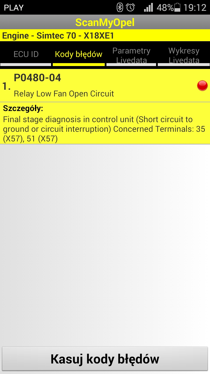 sprawdziłem przekaźniki w skrzynce w komorze silnika mam dwa od wolnego biegu i szybkiego. Ściągnąłem z nich zielone obudowy i zwierałem styki ręcznie i jednego i drugiego. Na każdym jest prąd i po zwarciu styków wentylator uruchamia się i na wolnych obrotach i na szybkich. Świeci mi się CHECK z błędem P0480-04 Relay Low Fan Open Circuit