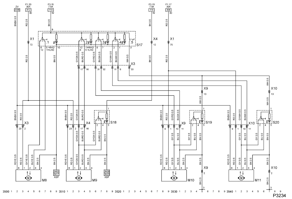 Te małe numerki przy kablach w złączach X9, X10 to numery pinów. Musisz przeanalizować 3 schematy które załączam jako obrazki tutaj. Chodzi o to, że we wtyczce masz kable głośnikowe, centralnego zamka i szyby - stąd 3 schematy.