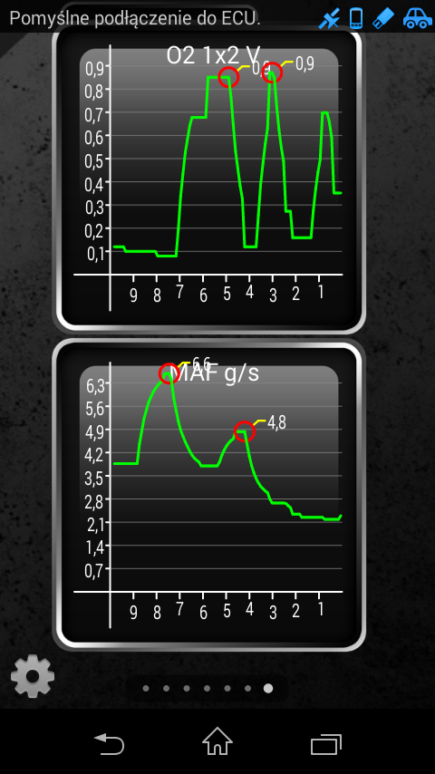 Tutaj reakcja sondy lambda, tej za katalizatorem oraz wskazania przepływomierza. Wykres robiony na postoju, podnosiłem tylko kilkukrotnie obroty do około 2tys