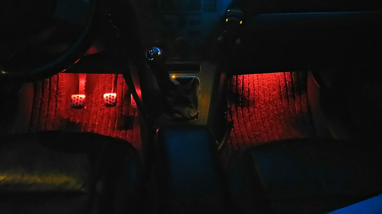 Dziś mając trochę wolnego czasu, zainstalowałem podświetlenie nóg. Na razie przód. Do podświetlenia wykorzystałem taśmę led po ok 15cm (3 sekcje). Zasilanie pociągnąłem od podświetlenia zapalniczki. Przy okazji wymieniłem żarówkę od podświetlenia zapalniczki.