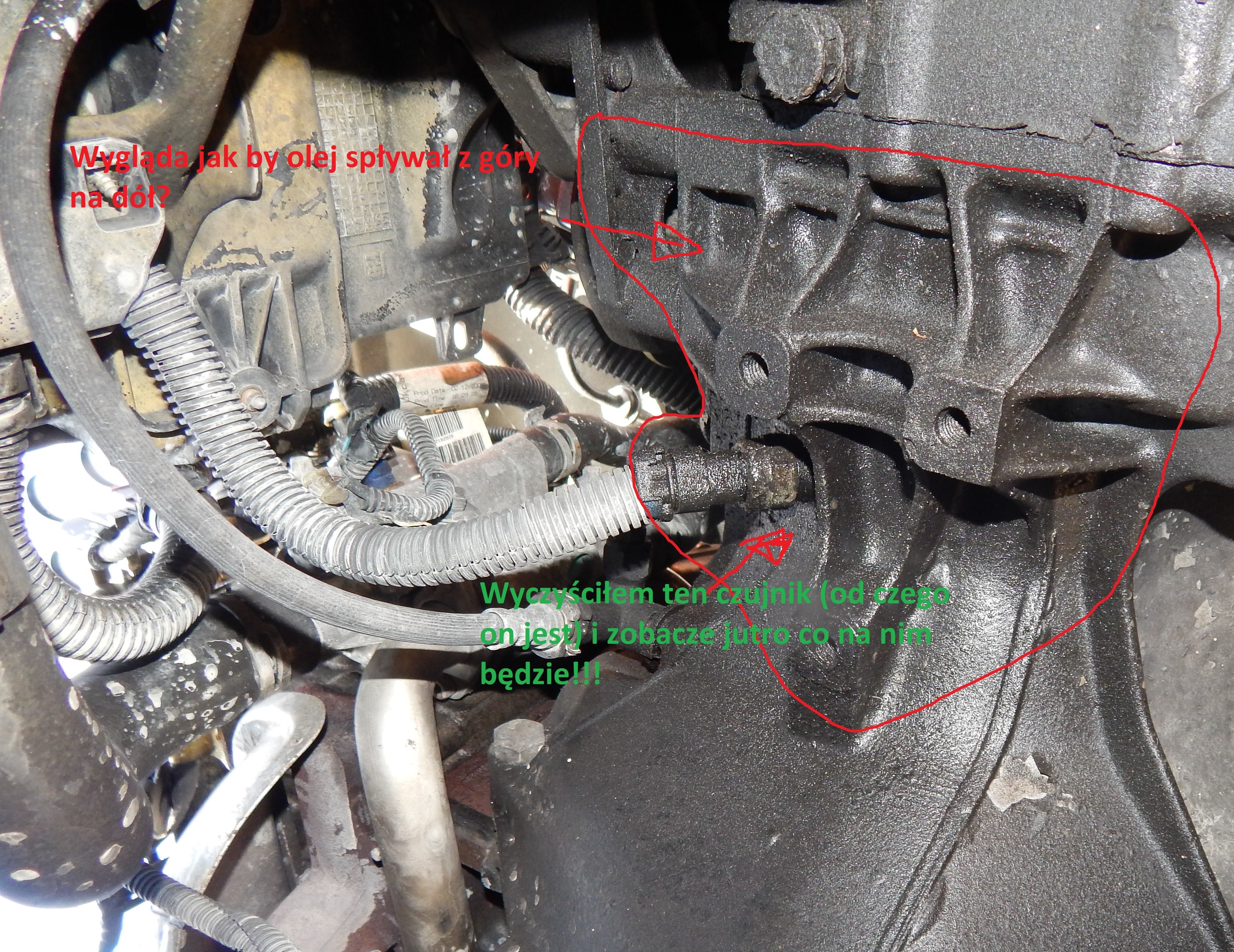 Na załączonych zdj pokaże gdzie to jest. Podejrzewam uszczelniacz na wale, ale pewien nie jestem. Zrobiłem z 350 km a na bagnecie ubyło z normy do minimum. Co ciekawe plam od oleju nie zauważyłem! Nie kopci na niebiesko, biało czy czarno! płyn chłodniczy czysty! Spalanie ok 8l (110-130 goniłem cały czas)