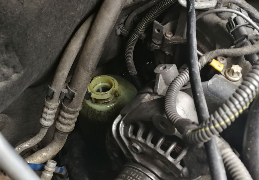 Na silniku, dla wygody, demontujemy kolejno: 1 - pokrywę górną silnika, 2 - odpinamy pokrywę górną filtra powietrza z wężem dolotowym i przepływomierzem, 3 - odpinamy rurę wlotową do przepustnicy i odsuwamy ją na prawo (będzie wisieć na wężu od odmy komory klawiatury). Tym samym uzyskujemy dość wąski ale w sumie wygodny dostęp do pompy wspomagania kierownicy, zamontowanej niżej, na ukos, za dolną obudową filtra powietrza (na foci pompa z już z odkręconym korkiem):