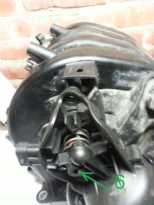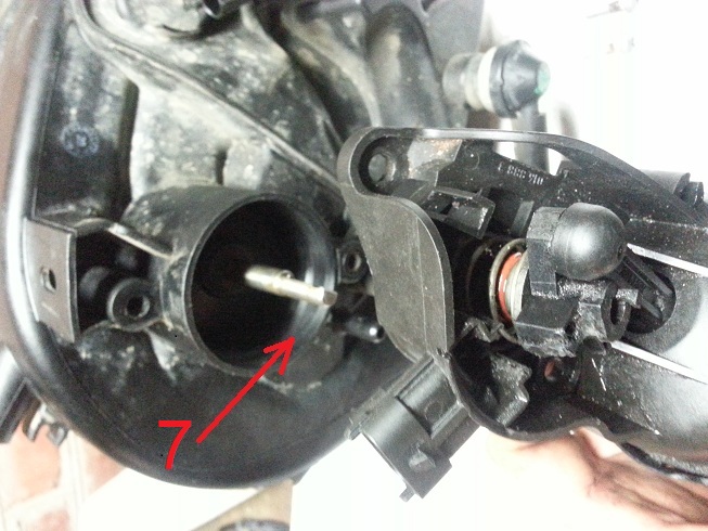 fot.2 wyciągamy przewód z mocowania nr3, odkręcamy śruby nr 4,teraz możemy całość wyciągnąć z kolektora ale trzyma zatrzask plastikowy nr5, musimy delikatnie podważyć jakimś ostrym szpikulcem (ja użyłem sklepanego na imadle gwoździa) i pobijamy delikatnie w trzpień nr6,