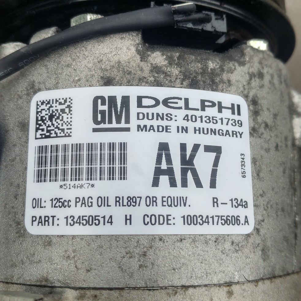 U mnie jest Delphi AK7, GM 13450514, tabliczkę znamionową masz na zdjęciu. Olej do tej sprężarki to PAG 46, ilość całościowa w układzie to 125ml. Czynnik R134a, ilość 630g Uszczelki na połączeniach rurkowych kompresora: większa 25.2mm(średnica zewn.) GM 24436645, mniejsza19.1mm(średnica zewn.) GM 24436646